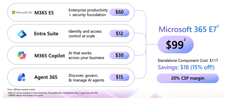 この宣言を裏付けるように、Microsoftは2026年3月、従来のE3/E5の上位ティアとなる「Microsoft 365 E7」(月額 約99ドル/ユーザー)を発表した。これはCopilotやAgent 365コントロールプレーン、高度なセキュリティを統合した、まさに「エージェント・ファースト」のエンタープライズライセンスである(図1参照)。