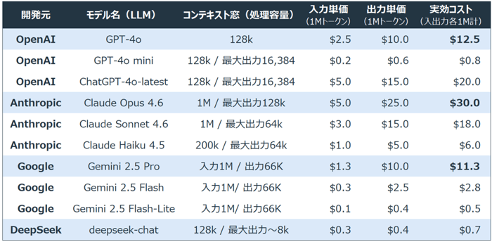 図2:主要LLM(大規模言語モデル)における「100万トークン」あたりの従量課金比較