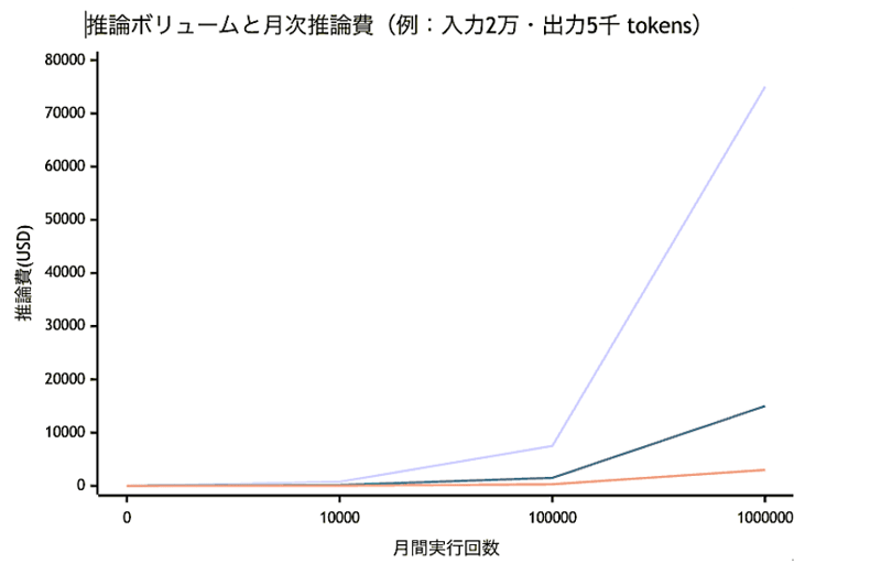 図4:OpenAIの各モデル(GPT-5:青線・GPT-mini:黒・GPT-nano:赤)における推論ボリューム別コスト試算